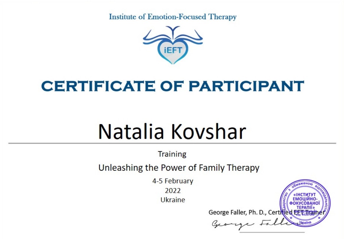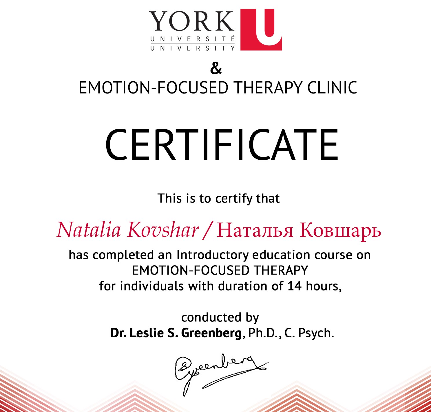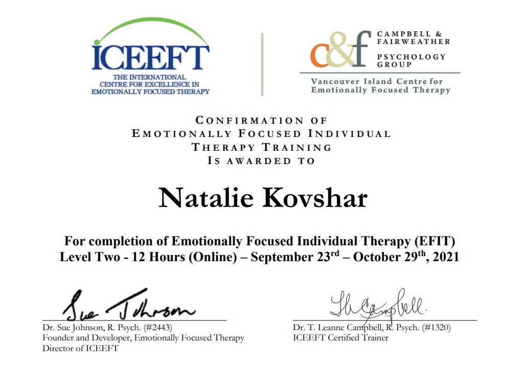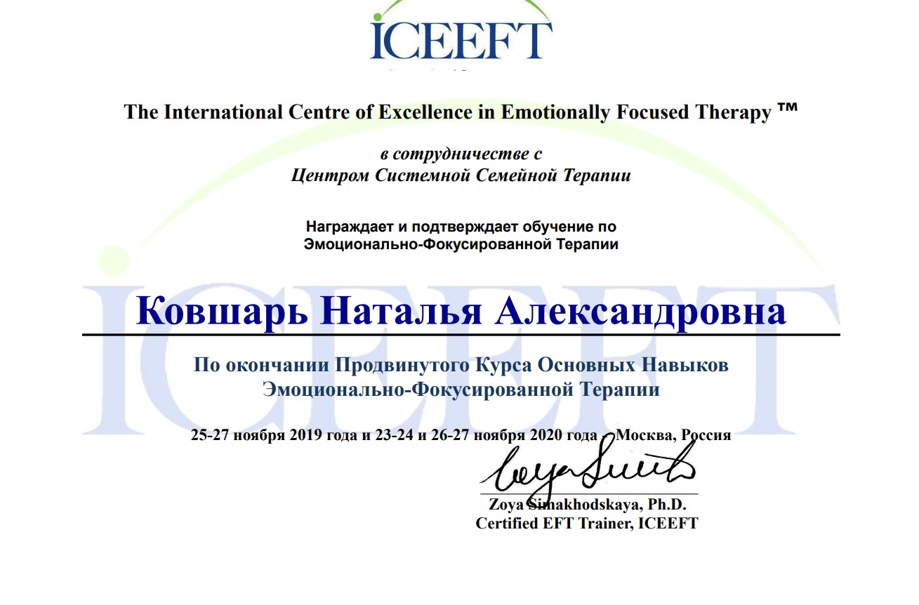 2019 г. – The International Centre of Exellence in Emotionally Focused Therapy в сотрудничестве с ЦССТ «Эмоционально Фокусированная терапия»